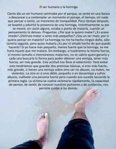 Cierto día un ser humano caminaba por el parque, se sentó en una banca a descansar y a contemplar un momento el paisaje, el tiempo, sin nada que pensar o sentir, un momento de tranquilidad. Poco tiempo después, se levantó y advirtió la presencia de una hormiga, instintivamente su pie se movió, sin razón alguna, estaba apunto de matarla, cuando un pensamiento lo detuvo. Preguntas: ¿Por qué la quiero matar? ¿Es acaso miedo? ¿Disfruto matar a seres más pequeños? ¿Soy un ser malo, por si quiera pensar en matarla? La hormiga no me ha hecho ningún daño, sólo camina vagante, pero quise matarla ¿Es por el simple hecho de que puedo hacerlo? Sí yo fuera más pequeño, menos fuerte que la hormiga, se me haría injusto que me matara. Sin embargo, si tuviéramos la misma fuerza, el mismo tamaño e intentáramos matarnos, no sé sabría quien ganaría y cada uno buscaría la forma para poder obtener una ventaja, tener más fuerza, ser más grande. Esta actitud nos lleva al exterminio. Para evitar esto tendríamos que guardar dos premisas básicas, si eres más fuerte, más grande, si tienes una ventaja sobre otro ser no abuses, no mates, no violentes. La otra es si eres débil, pequeño o en desventaja y sufres abusos, vuélvete una persona fuerte pero cuando eso suceda recuerda la primera regla. La víctima se vuele victimario rápidamente, la capacidad de pensar, de sentir, de conocer nuestras pulsiones y de cuidarnos, nos permite cuidar a los demás.